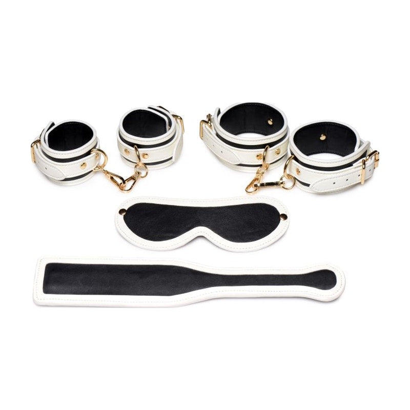 Wrist cuffs, ankle cuffs, paddle, and blindfold included