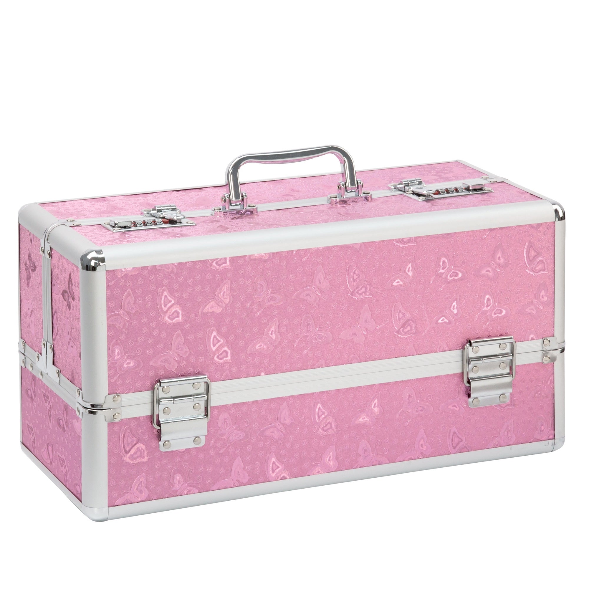 Sturdy but light. Metal frame. Hinged, swing open top with an integrated shelf. Luxurious faux leather internal lining. Solid black colour with brushed metal trims. Metal handle and hinges. Twin locking clasps and dual combination locks. Add a luxury feel to your ‘me-time’ as you open your beautifully styled case to reveal your little besties inside.